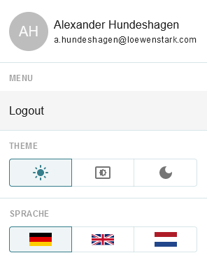 In der rechten oberen Ecke können Sie Ihr Profil einsehen, mit dem Sie angemeldet sind. Hier finden Sie zusätzliche Einstellungsmöglichkeiten, wie einen Dark-Mode oder weitere Sprachmöglichkeiten. Ebenso können Sie sich hier auch aus dem Tool ausloggen.