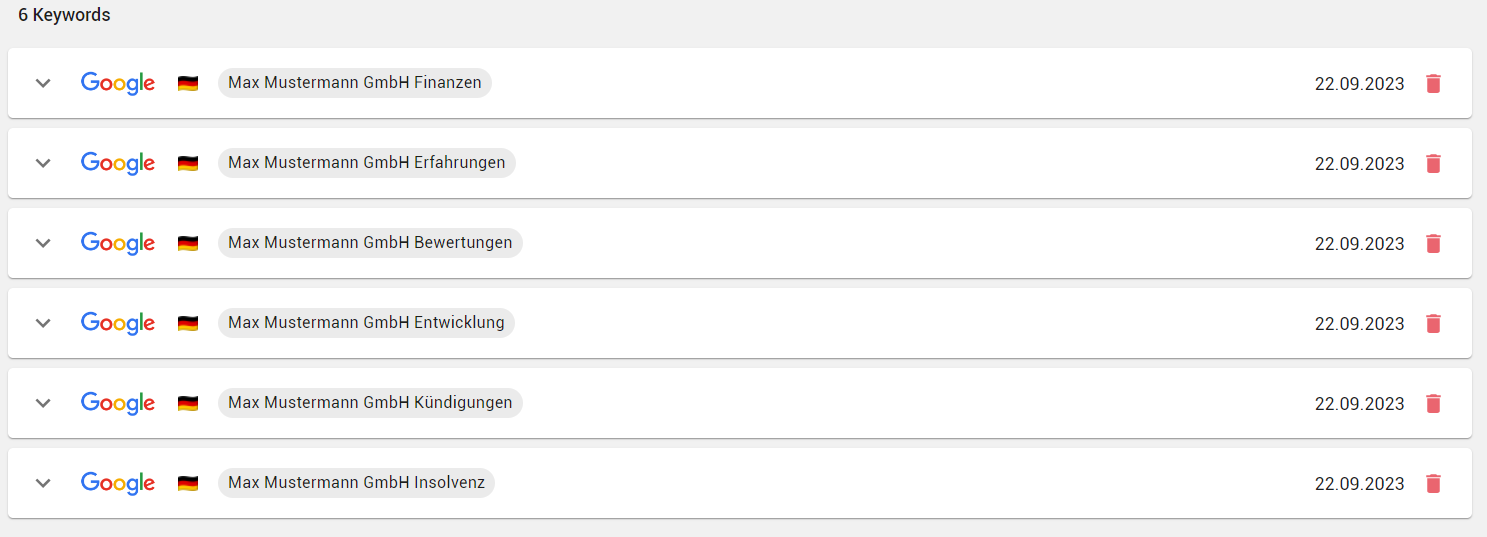 Über die Keywords, können Sie ausgewählte Begriffe, welche im Zusammenhang mit Ihrem Unternehmen stehen, über das Tool einschätzen lassen. Diese Einschätzung wird anhand einer Sentimentanalyse im Ampelprinzip umgesetzt.