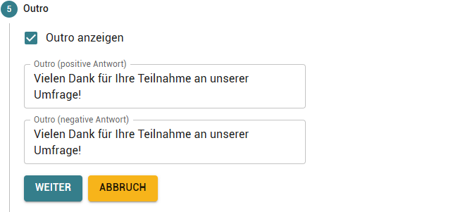 Hier können Sie den textlichen Inhalt des Intros sowie das des Outros individuell auf Ihre Wünsche anpassen. Alternativ können Sie das bereits hinterlegte Beispiel nutzen, welches wir für diese Umfrage empfehlen. Der Inhalt kann dabei passend auf eine positive oder negative Teilnahme abgestimmt werden, sofern eine Weiterleitung zu einem Bewertungsportal gewünscht ist..