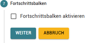 Hier können Sie optional einen Fortschrittsbalken für die Umfrage aktivieren. Dieser zeigt den Teilnehmern stets den aktuellen Bearbeitungsstand und die Gesamtzahl der Umfrageseiten an. Der Fortschrittsbalken verwendet die Primärfarbe, die Sie in den optionalen Einstellungen Ihrer Umfrage festgelegt haben. Diese Einstellung kann nachträglich bearbeitet werden.