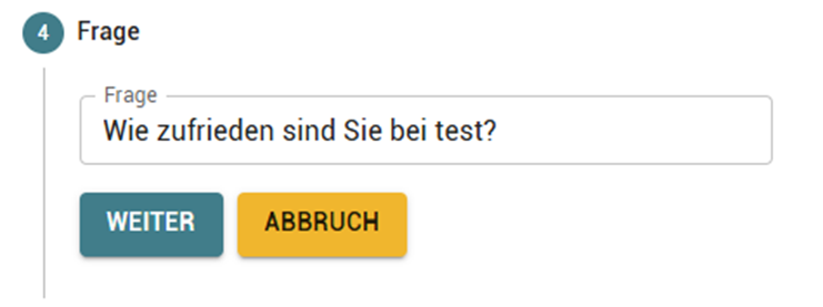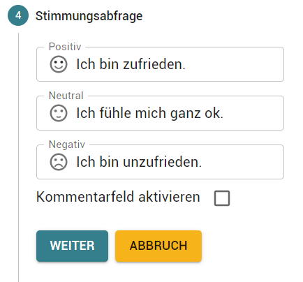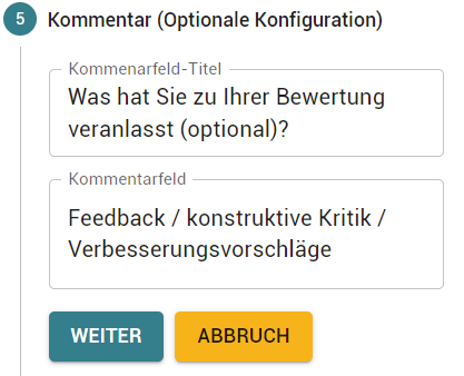 Die Fragen können inhaltlich angepasst werden oder mit "WEITER" bestätigt werden. Eine Aktivierung des Kommentarfeldes für weiteres Feedback der Bewertenden ist optional möglich.