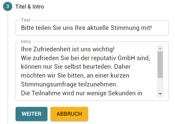 Dieser Text wird vor Umfragestart angezeigt werden. Hier findet sich bereits ein hinterlegtes Beispiel, welches aber textlich angepasst werden kann.