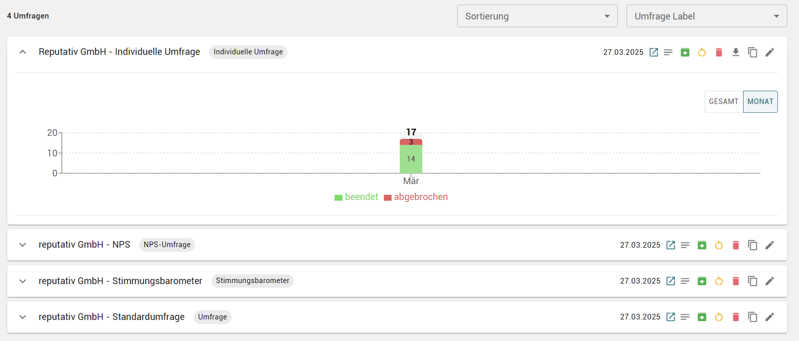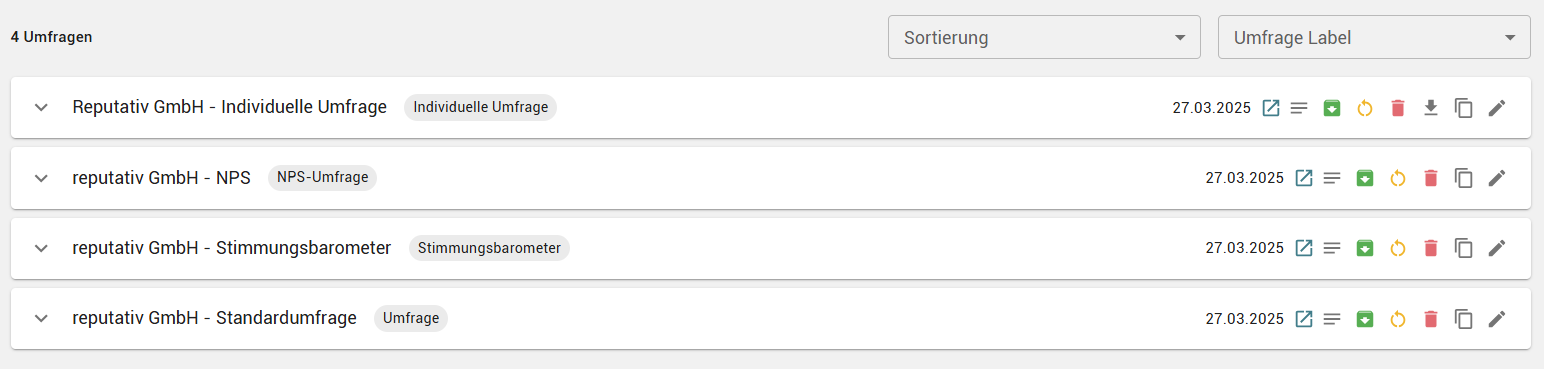 Wenn Sie eine große Anzahl von Umfragen haben, können Sie oben rechts die Filterfunktion nutzen. Damit können Sie nach einem angelegten Label filtern oder Ihre Umfragen nach verschiedenen Kriterien sortieren.